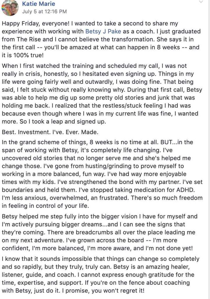 Oh boy, at that time I had no idea what she meant and felt I was doing the work, I was going through the curriculum, watching the videos and participating in group. I was sitting with what I was hearing and things resonated but I wasn't working through the worksheets. I would read them and decide I didn't have time to dedicate to them and would circle back. I can't remember what it was that caused things to click, but I started to do the worksheets, made the time and have learned so much about myself, healed things that I didn't realize were there. I have gained understanding, compassion, acceptance of the most important person, ME. I have learned new skills in communication. I have found courage. I am showing up for myself. I am applying things that I have learned to every aspect of my life. Although I do not know how my marriage will go from this point forward, I feel confident that I have been able to communicate with my husband about my needs, desires and dreams. I do know what I want and what I will not tolerate and have communicated it. Now it is time to see if he can meet me where I am. I have discovered that I have a map of my life and within that map, many directions that I could go. I am open and accepting to any of them. I will keep going down one path and if that doesn't work, I will try another route. I have learned that I can change my mind at any time. How freeing is that? Not just knowing or telling myself that I have control over my own life, feeling it!"